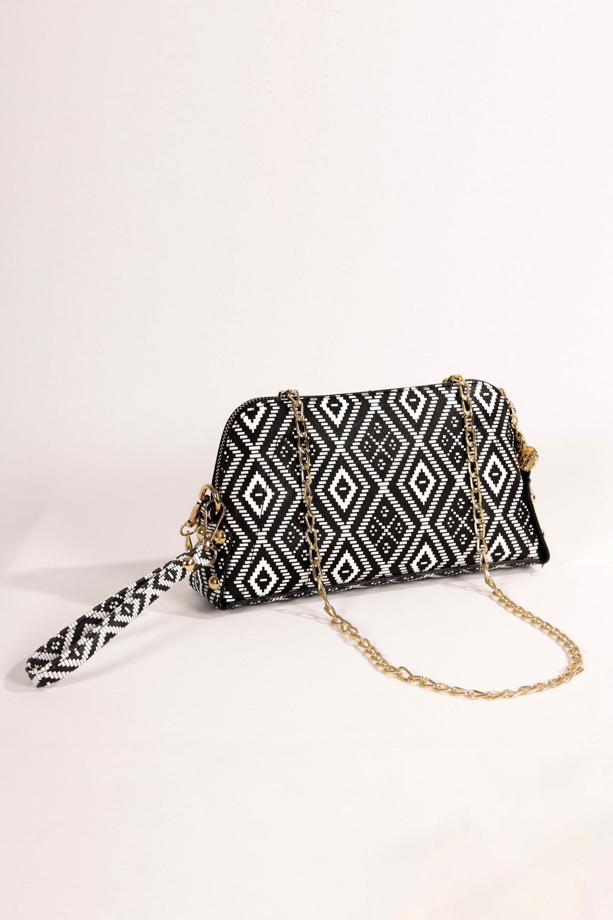 Zincir Askılı Çanta Siyah Beyaz Kilim Desenli
